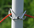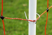 Using a rigid fiberglass post as a corner post in between the net posts so that guy strings and pegs are not needed.